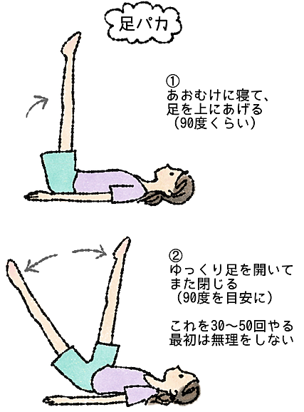 1の図のようにひざを伸ばしたまま、足を約60度に上げ、横に大きく開きます。