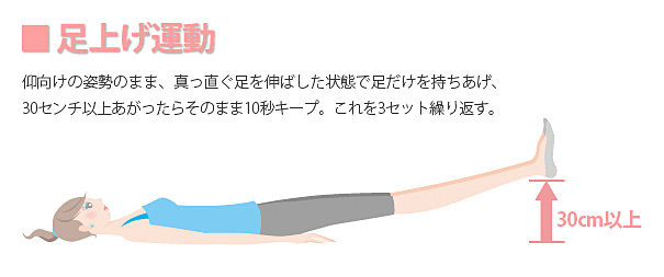 仰向けの姿勢のまま、真っ直ぐ足を伸ばした状態で足だけを持ち上げ、30センチほど上がったらそのまま10秒キープします。