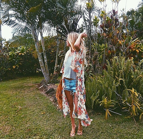 デニムのショートパンツをシンプルに合わせたコーデ。ハットやフリンジがついたショートブーツがヒッピーなアクセントになっています。
