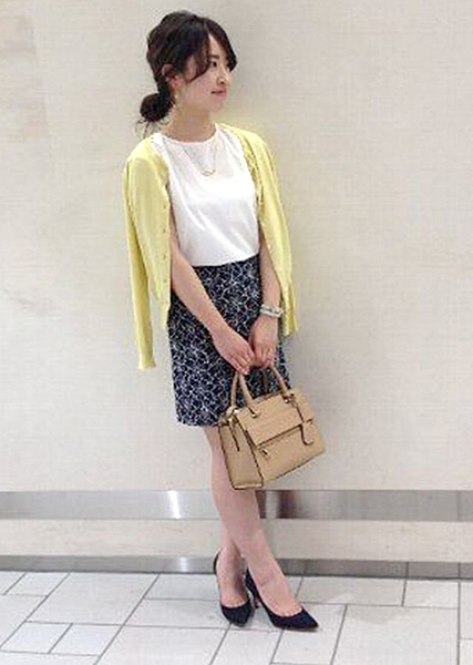 ライトカラ―のカーディガンには、ボトムスにダークカラ―を合わせるのがオススメ。フラワー刺繍が施されたスカートならクールかつフェミニンなスタイルに仕上がります。シルエットは、台形型を選んでみてね。