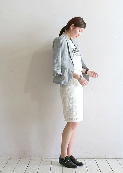 ラフに感じるTシャツも、上にジャケットを羽織ればたちまちオフィススタイルに!リネン素材など、ドライな質感ものなら涼しげに着こなせますよ。形は、2つボタンが定番のテーラードジャケットがオススメ。