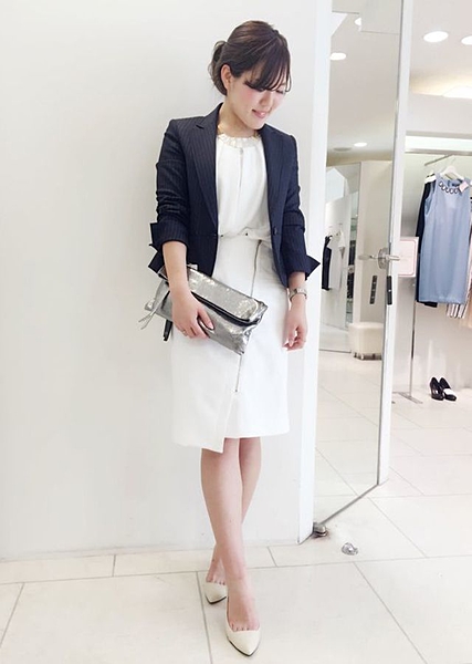 ジャケット×パンツスタイルだと、ビシッと決まりすぎる…。そんな時は、ボトムスにフレアスカートを合わせて女性らしい柔らかみをプラス。ホワイトカラ―の割合を多くすれば、明るく爽やかな印象に。