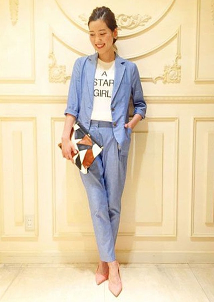 ジャケットを買うならセットアップがオススメ。スタイリッシュなテーパードパンツなら、いろいろなシーンで着まわすことができます。爽やかなブルーカラーには、パステル調のピンクパンプスを合わせて、かわいらしさも忘れずに。
