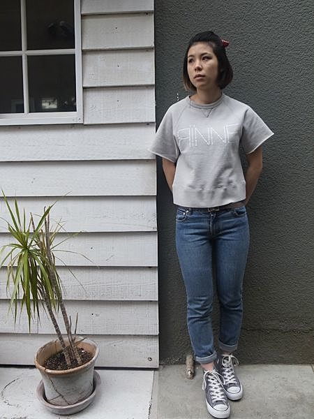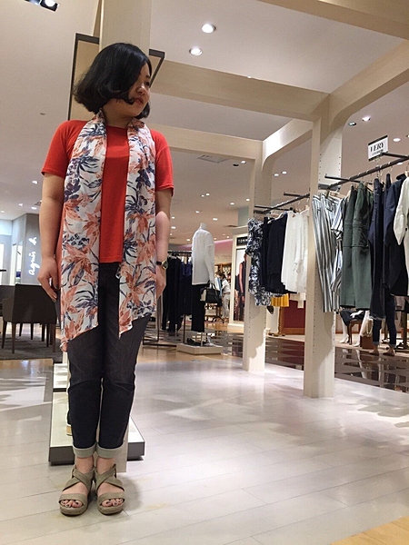 異素材使いの、Tシャツ。フロントのジッパーがカジュアルです。オレンジのトップスと、インディゴのスキニーデニムでミッドサマーなカラーリング。