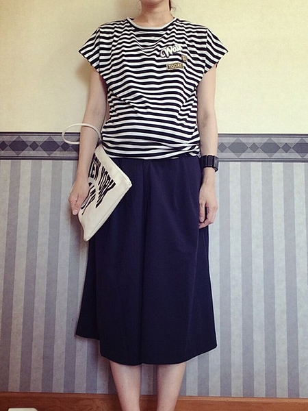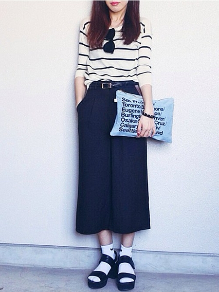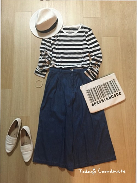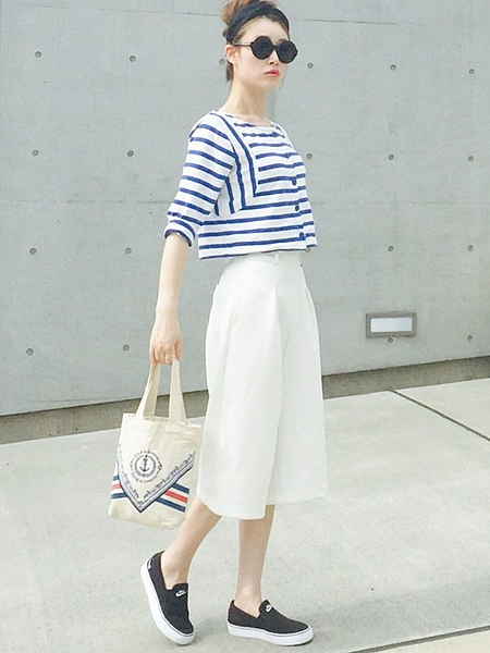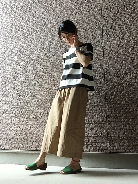ネイビーのガウチョパンツとボーダーは爽やかさ満点◎