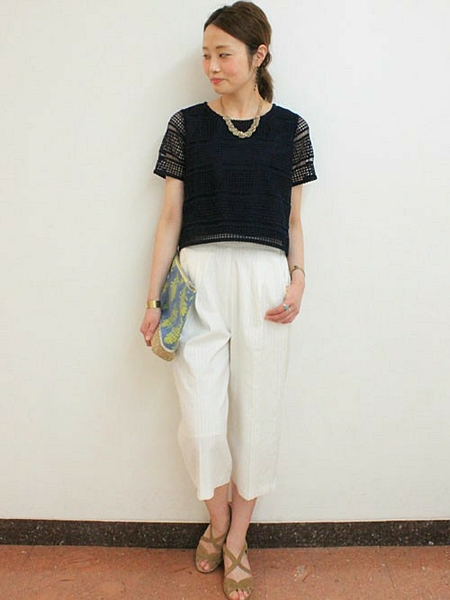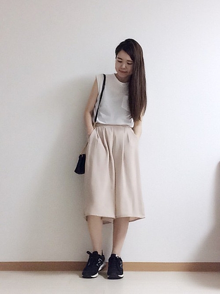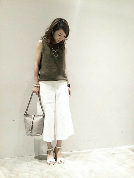 カーキのトップスはホワイトのガウチョパンツと相性抜群◎