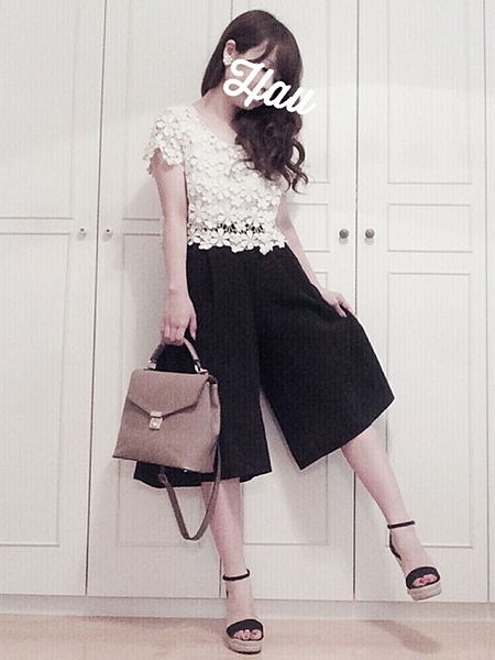 柄のガウチョパンツにブラックのクロップドトップスでバランス◎