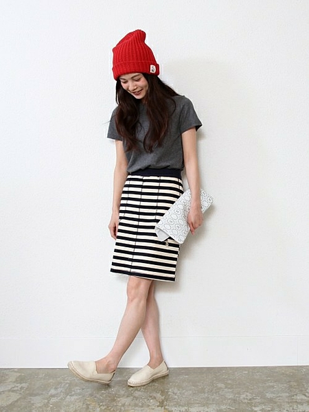 目を引くボーダータイトスカートは