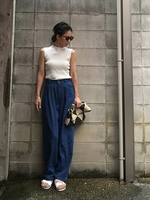 白トップス×デニムワイドパンツが