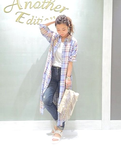 ショルダーや袖部分に異なるチェック柄をオンしたロングシャツ☆ソフトな生地感が生み出す、こなれた雰囲気!ウエストのギャザー使いでメリハリもプラスしてくれる嬉しいデザインにも大満足です☆