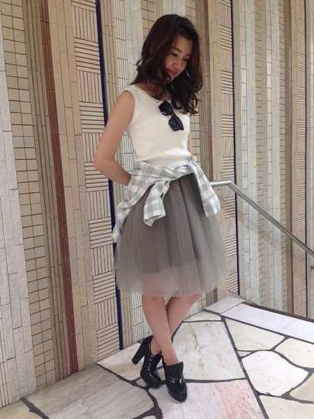 チュールの裾が可愛らしいデザインなので、大人っぽいコーデですがキュートさもありますね♡