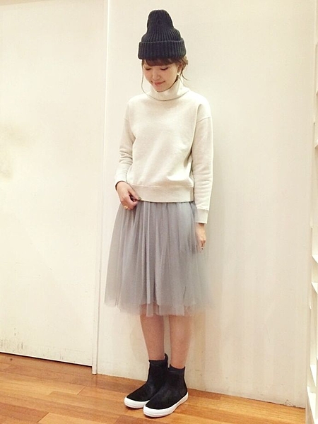 夏がすぎてもチュールスカート派大活躍します!ホワイトのニットにアイスグレーのチュールスカートを合わせると、秋冬でも着れちゃうんです。