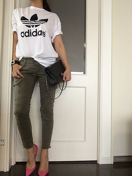 スポーティーなスタイルにも合う♩ピンクがコーデのアクセント。