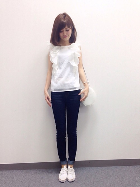 スキニーデニムで足長効果を狙う。