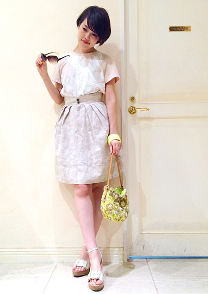 裾のラインがアシンメトリーになっているので、腰周りは自然なドレープが出て女性らしい着こなしに。袖はフレンチスリーブで、二の腕がすっきり見えるデザインです。
