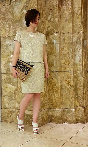 【Jewel Changes (ジュエルチェンジズ)】ワンカラーながら、繊細なジャガードファブリックと、シアーなシフォン生地を切り替えたフェミニンなルックスのセットアップ。