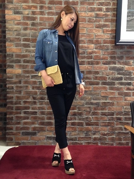 黒のTシャツと黒のパンツ、そして黒のサンダルを合わせて引き締め効果抜群のスタイルにしてあります。夏は黒だけだと暗く見えるので、ブルーのデニムシャツが生きてくるんです。