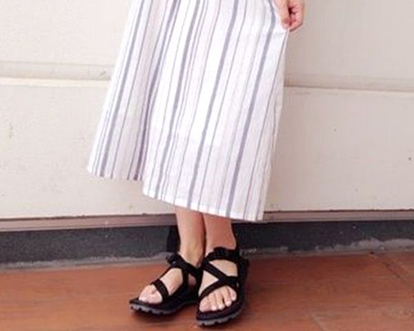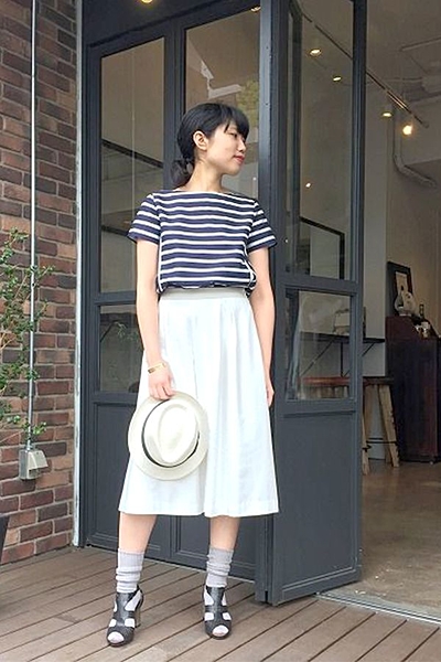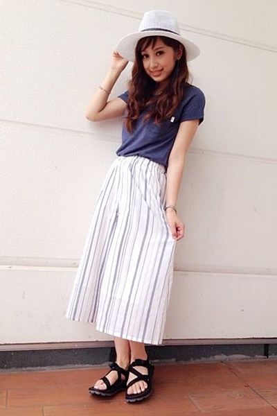 細身効果を期待したいならストライプ柄を選んでみて。膨張色のホワイトカラ―も縦のラインが入ることでスッキリとした印象で着こなすことができます。Tシャツとハットを合わせれば、サマースタイルの完成!