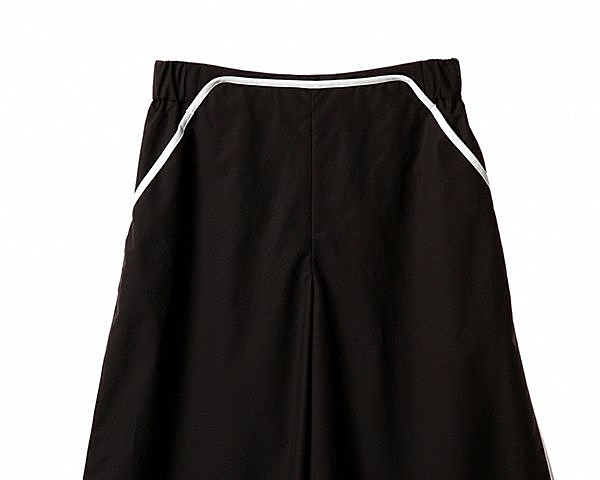 ウエスト部分に施したニットパイピングテープがポイントのガウチョパンツ。光沢感のあるコットン素材を使用しています。裏地をつけていないため、さらっとした生地の清涼感が楽しめる1本。