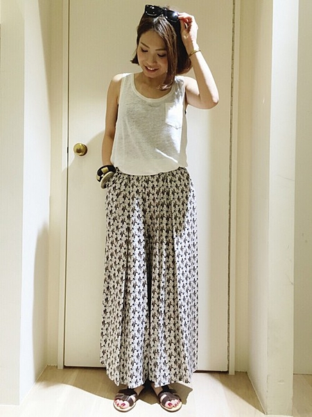 柄ワイドパンツにはシンプルなトップスでスッキリまとめるのが◎