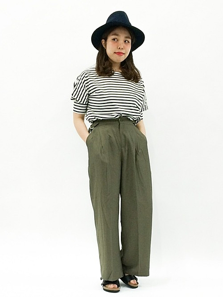 太さの異なるストライプの組み合わせが爽やかなワイドパンツ。ボリュームのあるゆったりシルエットですが、ウェストはキュッと締めメリハリのあるデザイン。