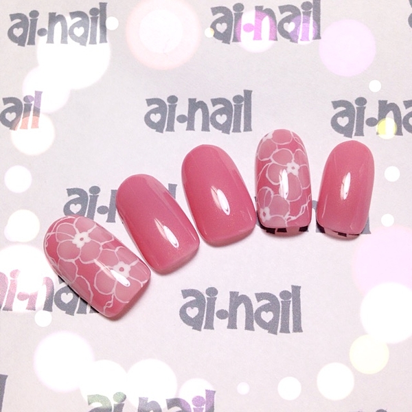 ピンクのベースに同系色のレース模様を。すこし立体感のあるデザインが奥行きが出ています。