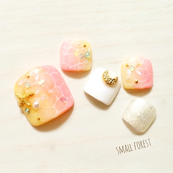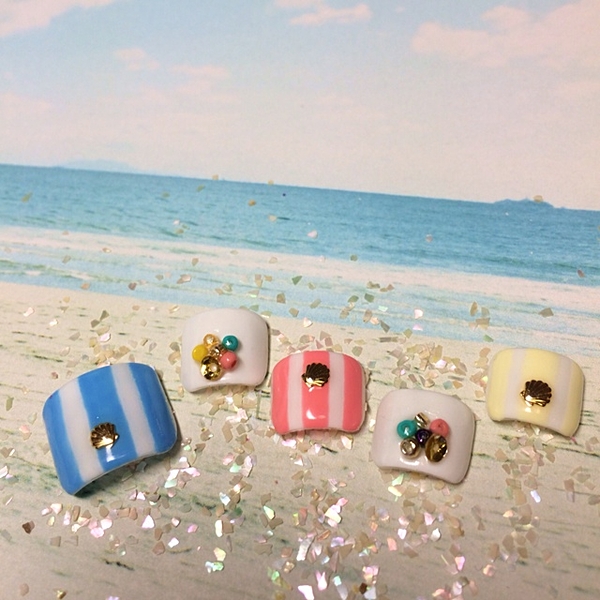 ホワイトのくりぬきシェルや、ゴールドのスターフィッシュは親指に大きめをのせてアクセントに♪
