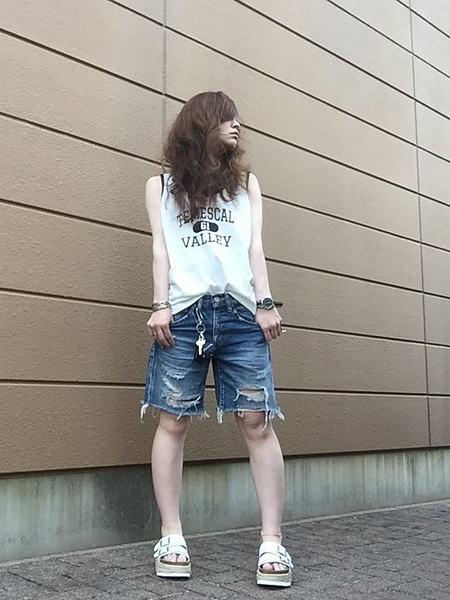 Tシャツにダメージのハーフパンツはラフでかっこいい女の子に◎