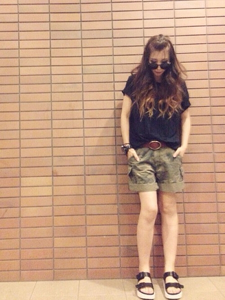 ブラックにまとめて、カモフラ柄のハーフパンツを際立たせて◎