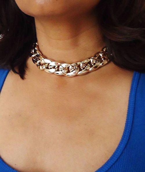 ゴールドチェーンは、青色などの原色系に合わせてゴージャスに。