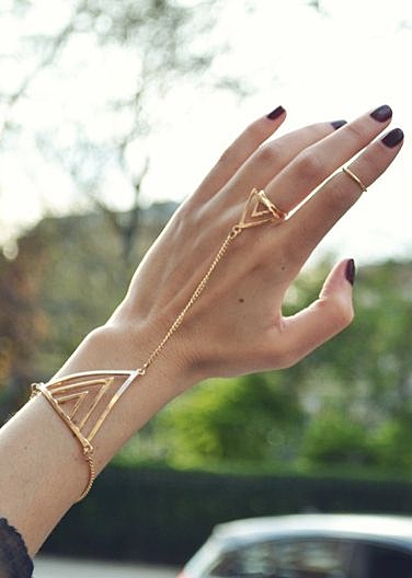 最近流行りの三角モチーフのハンドチェーンはゴールドで。