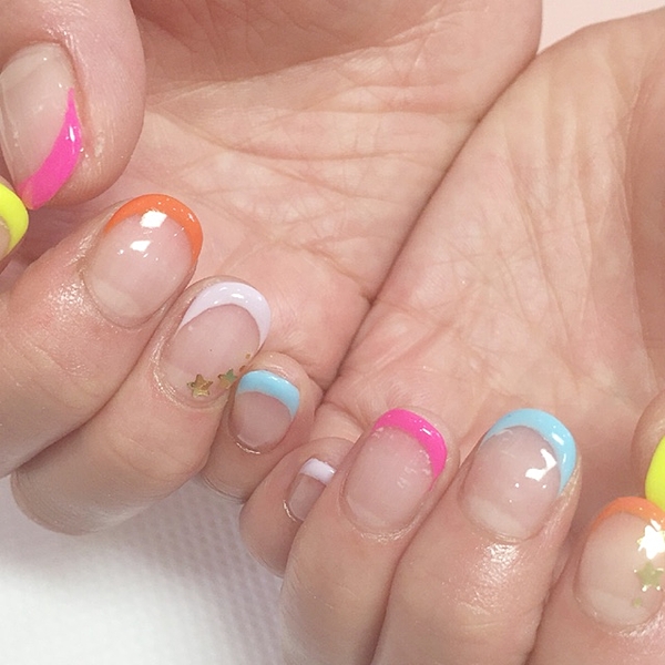 カラフルなホログラムで埋め尽くされたフレンチネイル!女の子っぽすぎないデザインです!