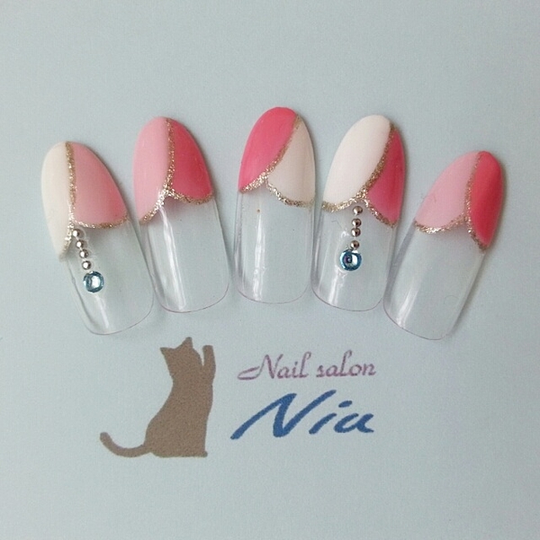 ピンクとホワイトで、ななめフレンチと丸フレンチを足したカンジに・・♪