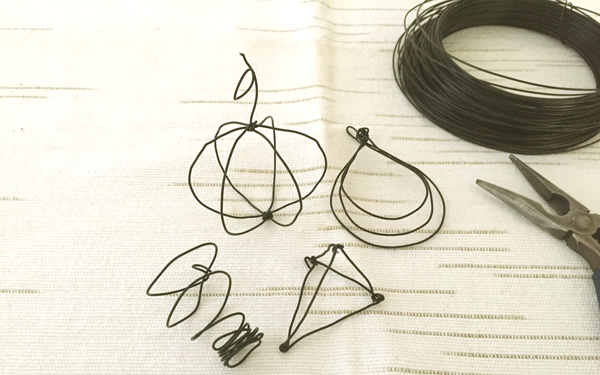 1.ワイヤーを適宜カットし、お好みのかたちに加工します。このとき、毛糸にからませる部分をつくっておきます。少々不恰好でも、ご愛嬌です。
