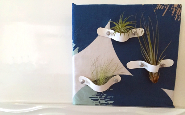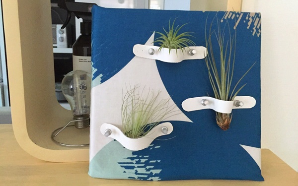 こちらは、布以外は100円ショップで購入できるグッズでつくった、エアプランツ用のファブリックパネルです。