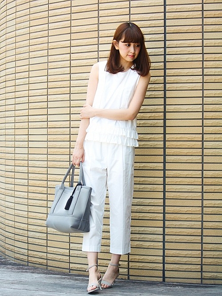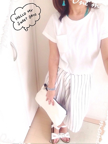 ホワイトコーデにターコイズブルーのワンポイントはとっても爽やか!