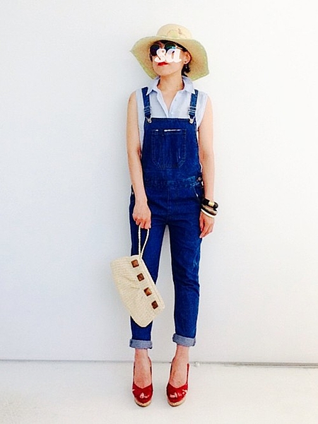赤のウェッジサンダル×デニムサロペットは爽やかさ10割増し♡