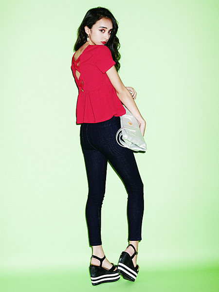 大胆なバックスタイルがポイント!背中をちょっぴり肌見せして、色っぽいレディに近づく♡ボトムは肌見せの少ないパンツを選ぶと、大人っぽくきまる。