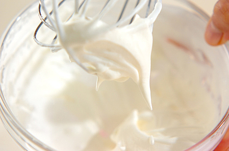 生クリームは、持ち上げた時に角が立つ位まで泡立てましょう。そうするとふわふわに、おいしく仕上がります*