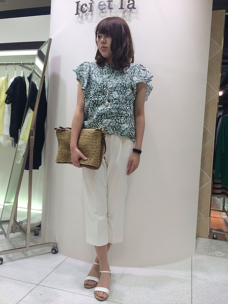涼しげな透け感のある花柄ブラウス。柔らかい生地感で、パンツスタイルでもフェミニンな印象に。袖がフリルなのもかわいいですね。