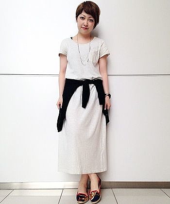 ストライプと黒の部分で引き締め効果が出て全体のシルエットがとても綺麗なロングワンピースですね。小物はシンプルにまとめるのが◎