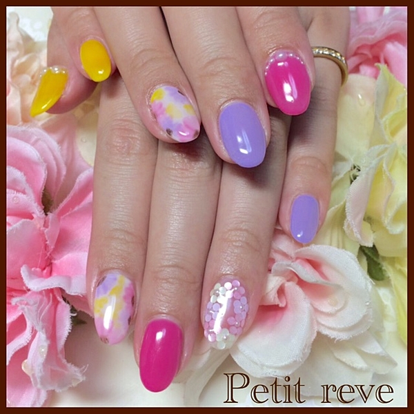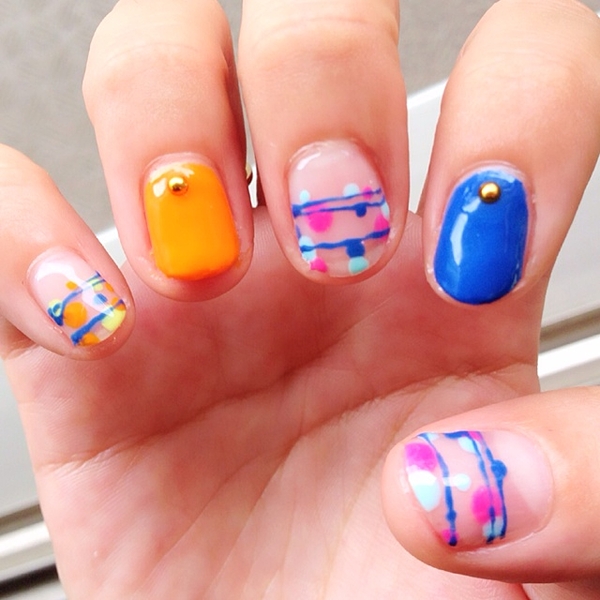 元気なビビッドカラーの単色ネイルを盛り込むだけでカラフルネイルに早変わりしちゃいます♡