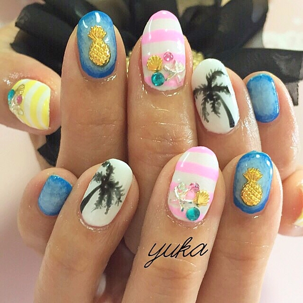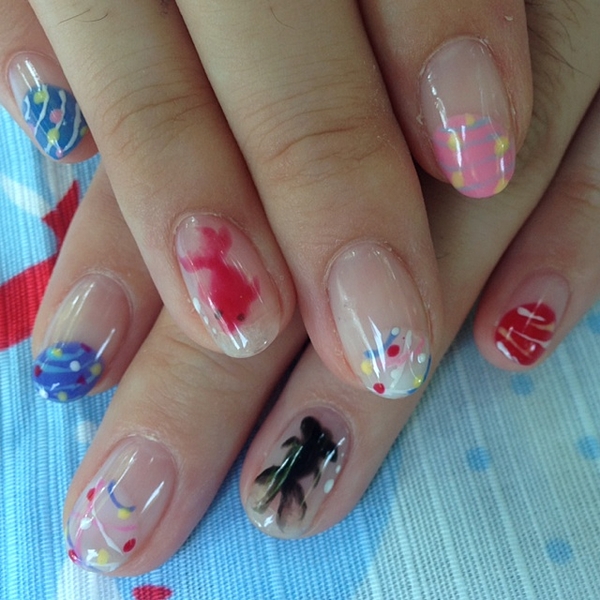 クリアベースにヨーヨーと金魚があしらわれた涼しげネイル。