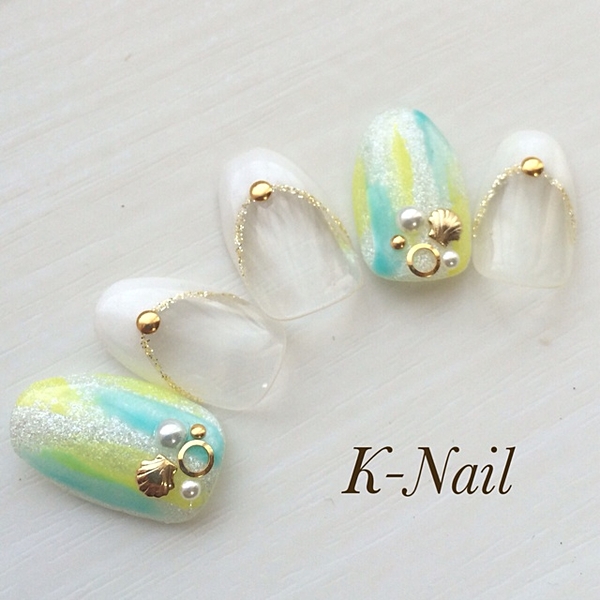 ゴールドのシェルパーツ1つで、一気に夏ネイルですね♡