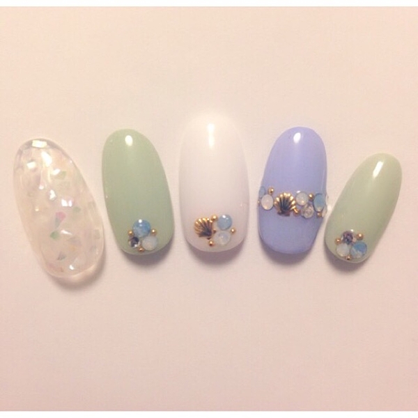 波打ち際をイメージしたグリーンとブルーのマーブルを斜めに入れ、シェルパーツで季節感を添えて。まるで人魚姫のようにリュクスなネイル http://t.co/iobdMGnYMl