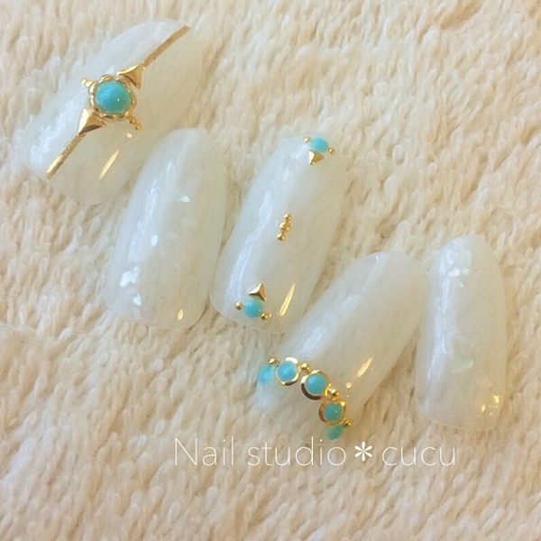 ホワイトベースにゴールドパーツを散らした指もオシャレですね♡