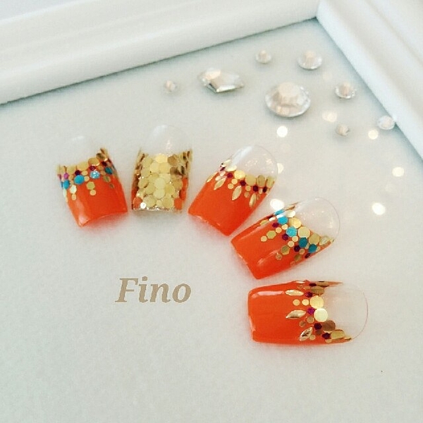 ベースはオレンジで、一本だけホワイトを入れたオシャレネイル◎