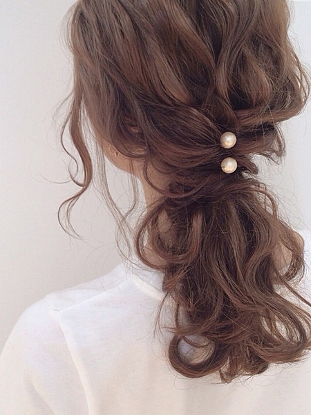 ③左のおさげを右の耳上あたりにもっていく。毛先は折り曲げてピンでとめる。