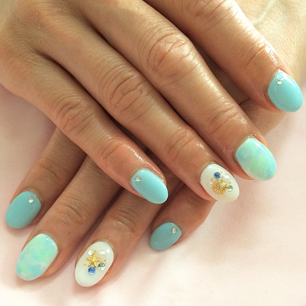 アイスブルーのワンカラーネイルです。シェルと水滴デザインが可愛い夏ネイルですね。