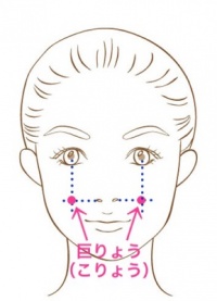 「巨」は東洋医学で「巨分(こぶん)」と呼ぶほうれい線を、「りょう」は骨の角を表します。頬から口元のむくみ、たるみを改善します。また、鼻づまりや鼻水の改善にも働くことが知られています。